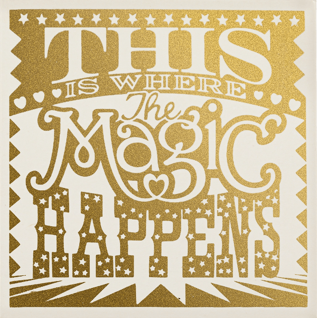 Our signature square matchbox with a gold screen-printed background and white detailing with the words ‘This Is Where The Magic Happens’ in bold type.